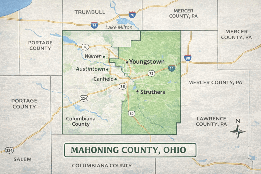 Mahoning County covers a mix of urban centers, suburban neighborhoods, and rural areas. It is bordered by several counties in Ohio and is part of the larger Youngstown-Warren metropolitan area, making it an important hub for business, education, and local culture.